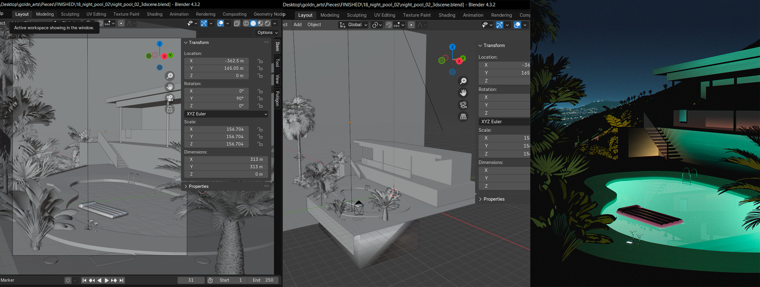 I use Blender for 3D concept and blocking, to model the scene’s lighting, perspective, and architecture.